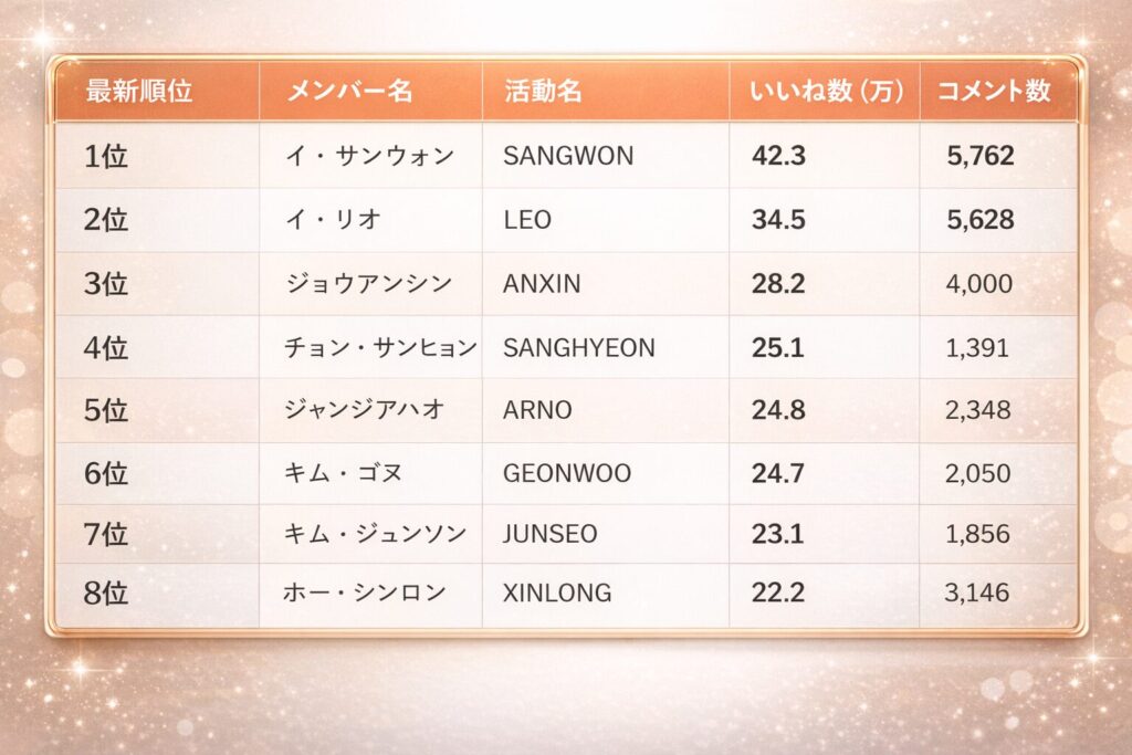 オーディション番組「BOYS2PLANET」の最終投票結果と、2026年現在の人気順位を比較してみると、グループ内で「人気構造の地殻変動」が起きていることがハッキリと分かりました。