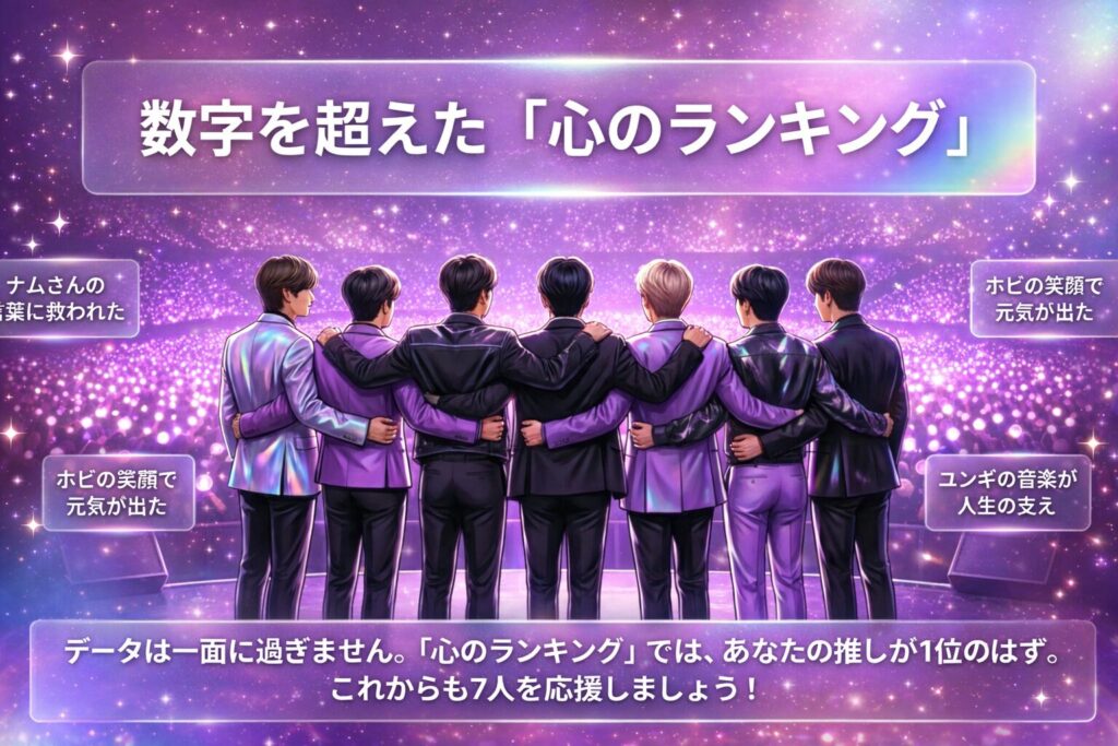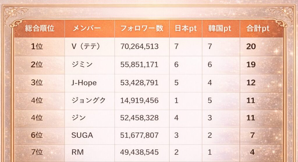 ※ジョングクに関しては、過去にInstagramアカウントを削除した経緯などがあり、現在確認できる数値が低くなっていますが、実際の肌感としての人気はトップクラスです。あくまで「数値化できるデータ」に基づいた順位となっています。