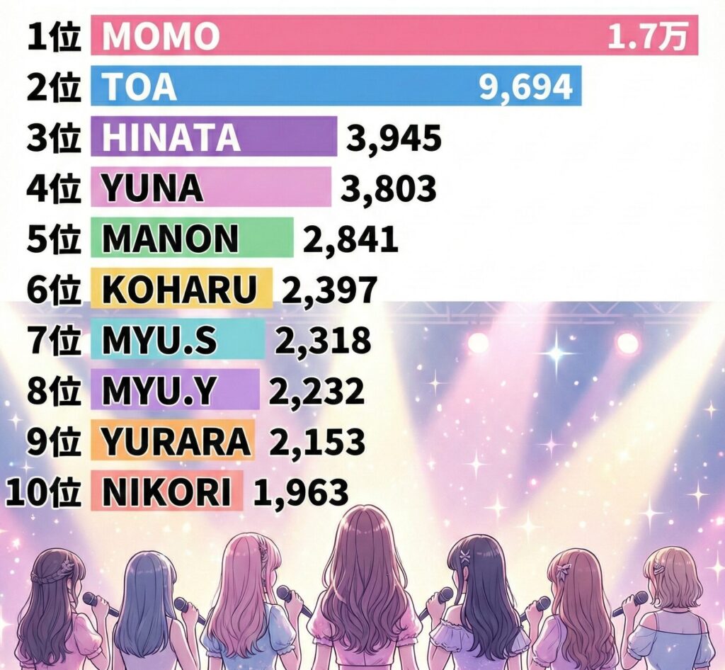 正直、ここまで数字に差が出るとは驚きでした!デビュー直後というのは「知名度」がそのまま数字に出やすいタイミングですが、既存デビュー組を抑えてオーディション出身のMOMOさんが1位というのは、彼女がガルバトで残したインパクトがいかに強かったかを物語っていますね。これからの活動でこの順位がどう変動していくのか、下位のメンバーがどう巻き返していくのかも楽しみの一つです。