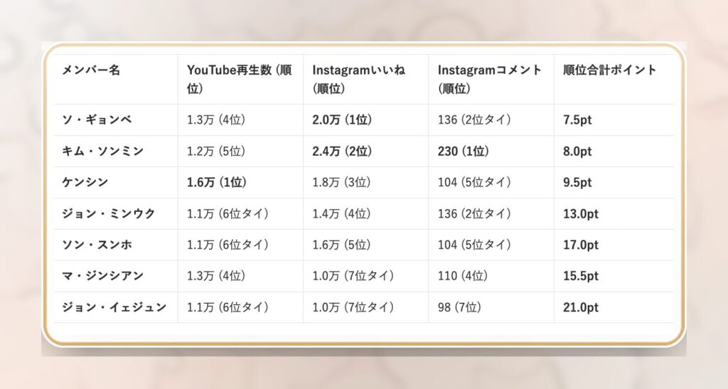 デビュー以降、メンバーそれぞれの個性や魅力が一気に可視化されてきたことで、ランキングにも大きな変動が出るタイミング。ファンなら最新状況をしっかりチェックしておきたいところです。