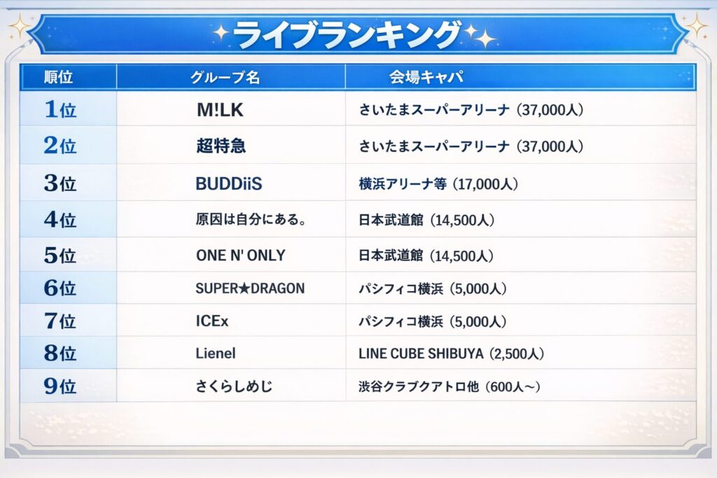 まずはライブの動員数を一発で把握できる図解ランキングをご覧ください。