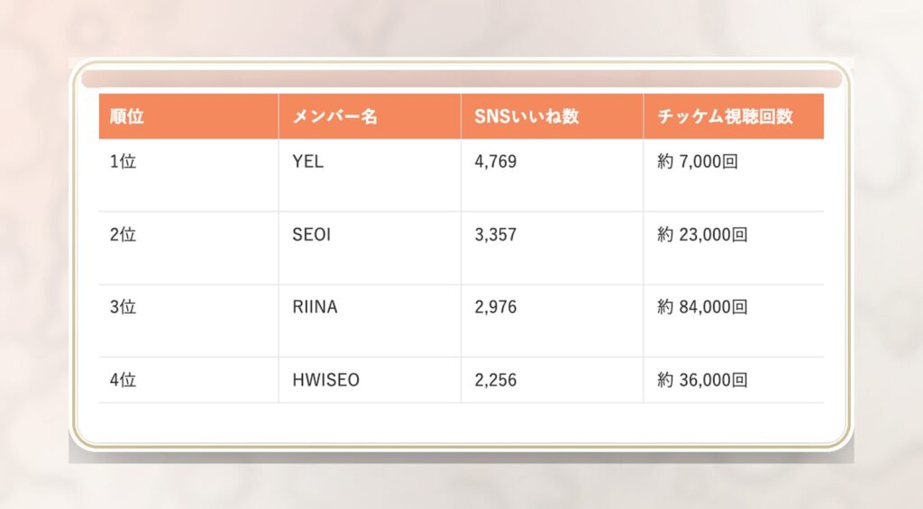 | 順位 | メンバー名 | SNSいいね数 | チッケム視聴回数 | ポジション |