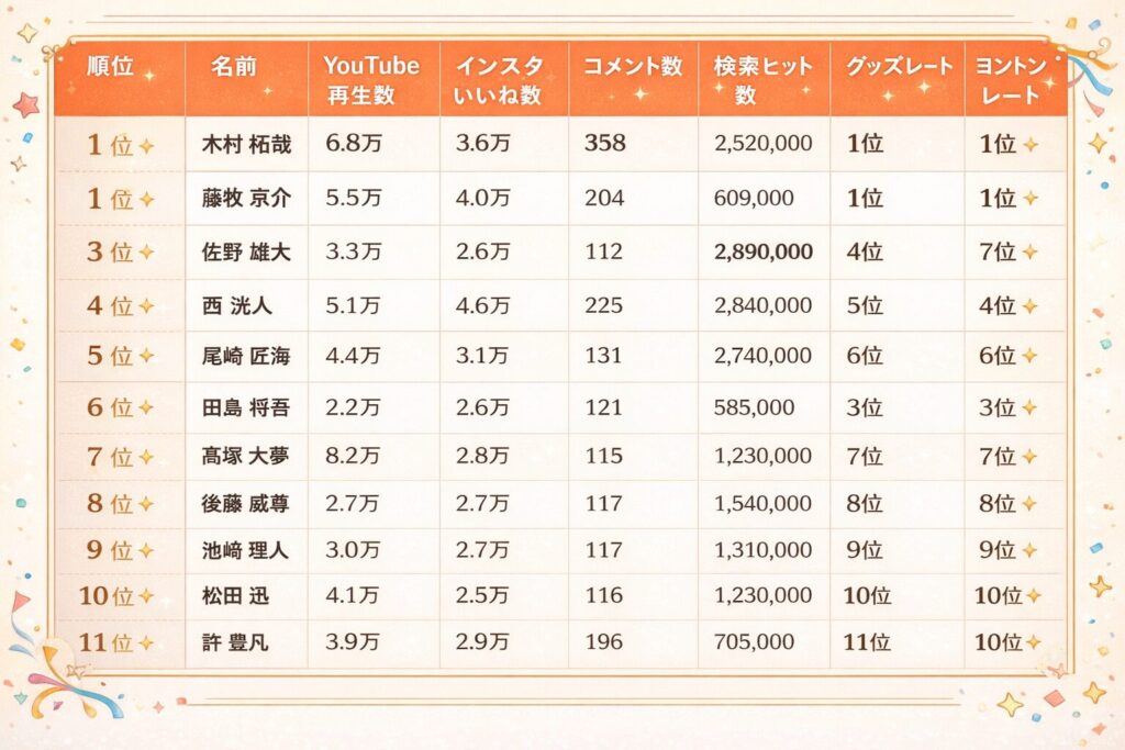 データ上の順位として木村柾哉くんと藤牧京介くんがトップを走っていることは間違いありませんが、佐野雄大くんや西洸人さんの猛追、そして田島将吾くんのコアな人気など、メンバーそれぞれに異なる「強み」があることが分かりました。