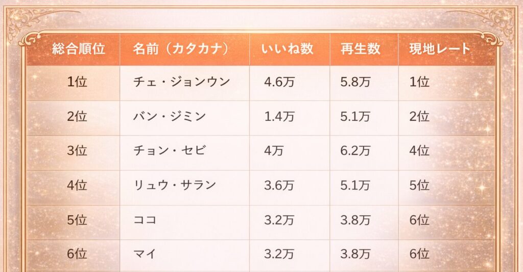※合計ptが高い順ではなく、現地レートや総合的な安定感を加味した順位付けとなっています。(例:ジミンは合計ptではセビより低いですが、現地人気が高く2位にランクインしています)