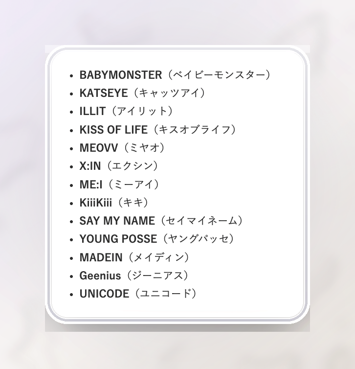 まずは、今回ランキングの対象となる、第5世代を代表するガールズグループたちをざっとご紹介します。2023年後半から2024年、そして2025年にかけてデビューし、瞬く間にスターダムを駆け上がった彼女たちがこちら!
