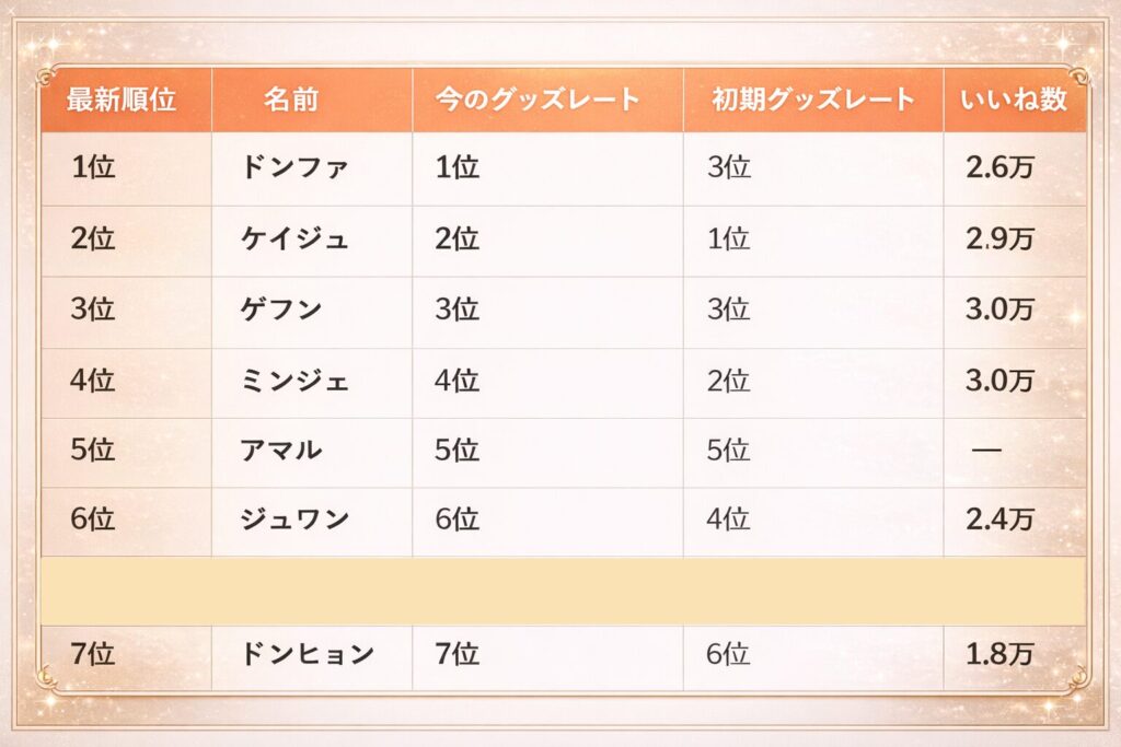 デビュー初期はケイジュやミンジェがトップを争っていましたが、ここ最近はドンファの爆発的なビジュアル進化と、ゲフンの安定した実力が順位を押し上げています!