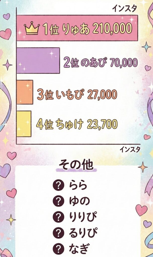 - トップ層の不動の人気: りゅあ、のあぴ、いもぴ、ちゅけの4人が知名度でリード!
