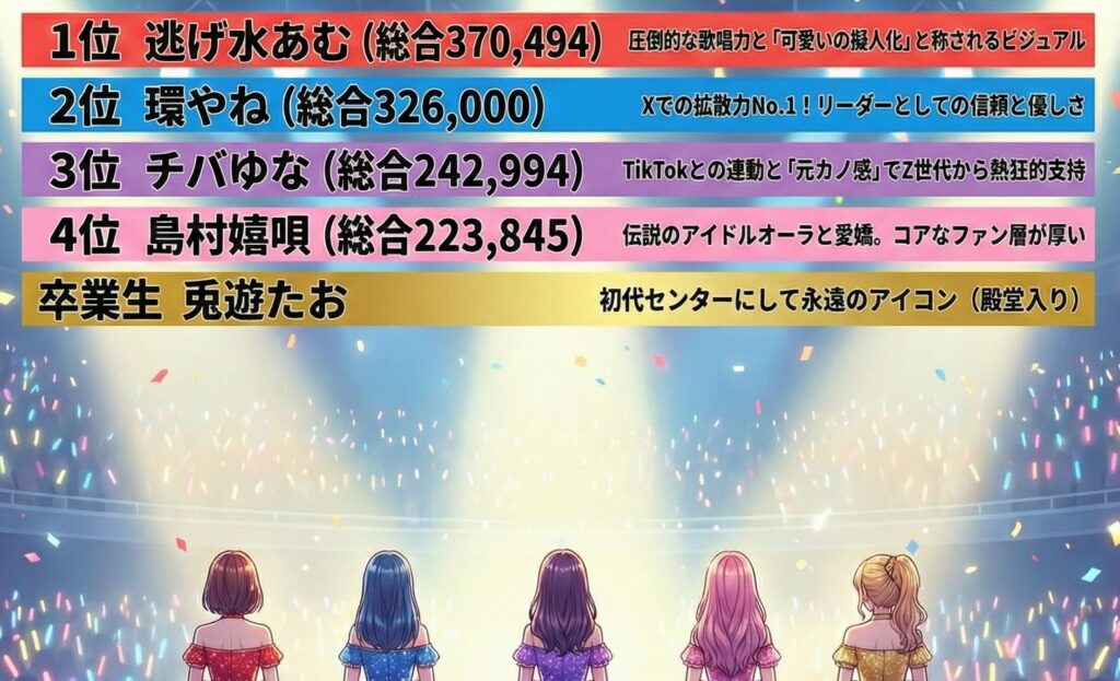 | 第4位 | 島村嬉唄 | 223,845 | 12.5万 | 9.9万 | 伝説のアイドルオーラと愛嬌。コアなファン層が厚い |