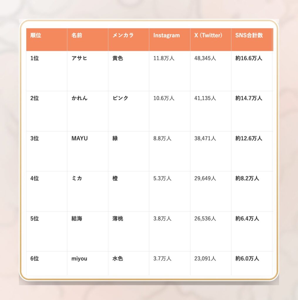 メンバーそれぞれの発信力や、どの層にアプローチできているかが見えてきますよ。今回はInstagramとX(旧Twitter)それぞれのランキングを作成し、「なぜその順位なのか?」という理由を、ファンの投稿や最近のトレンドから紐解いてみました。