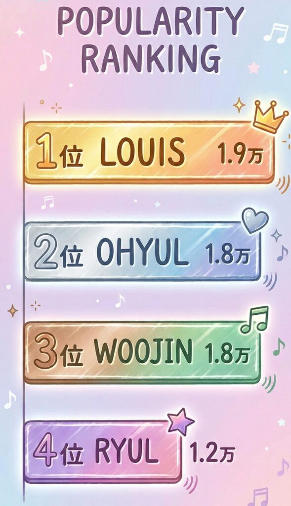 見事1位に輝いたのは、グループのマンネ(末っ子)であるLOUIS(ルイス)です!彼は186cmというモデル級の高身長を持ちながら、性格はとてもユーモアに溢れていて面白いとファンの間で話題になっています。SNSでは「ルイスが可愛すぎて推しになった」という声が続出しており、ティーン層を中心に圧倒的な支持を得ているのが特徴です。ビジュアルの強さはもちろん、ステージで見せる大人っぽい表情と、普段の無邪気な笑顔のギャップが最大の武器と言えるでしょう!