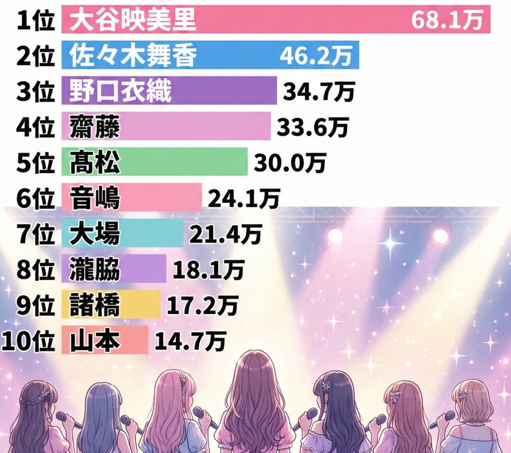 初期の人気は、第一印象のビジュアルが優れており、メディアでの露出が多かったメンバーに集中していたことが分かります。特に、デビュー時から「センター顔」として期待された髙松瞳さんや、愛くるしいルックスでファンを虜にした齊藤なぎささんが、グループの初期人気を牽引していましたね。