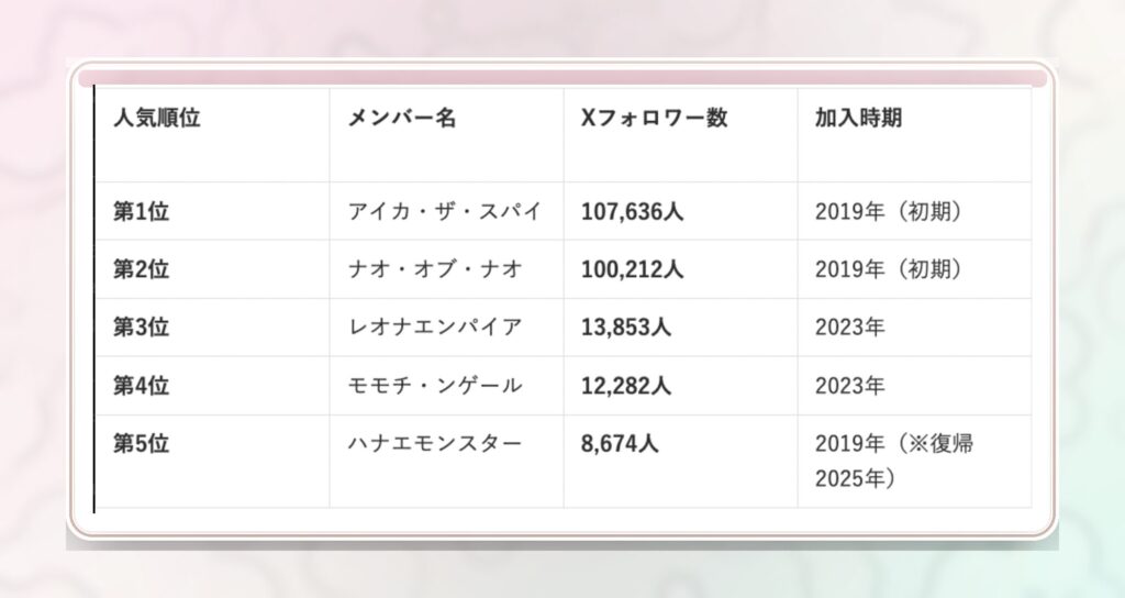 | 人気順位 | メンバー名 | Xフォロワー数 | 加入時期 |