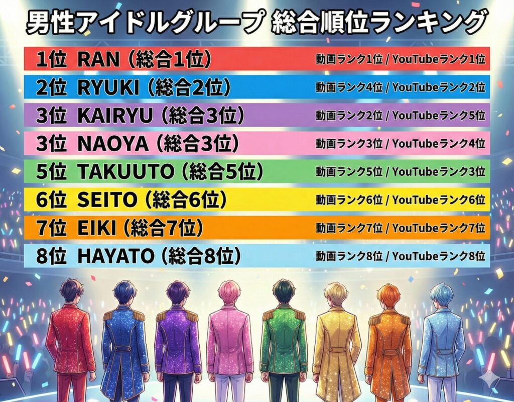 「デビュー1年目の天才ルーキー」という評価が広まり、動画でのキャッチーなキャラクターが認知されるにつれ、急速に順位を上げてきています。新規ファンを獲得する入り口として、彼の存在感は今後さらに増していくでしょう。