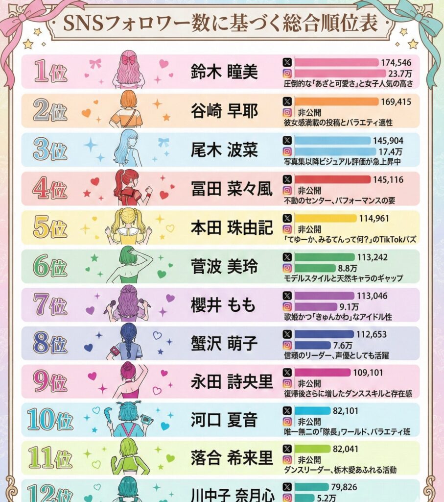 最下位に近いメンバーでも8万人近いフォロワーがいること自体、アイドル界全体で見れば驚異的な数字です。