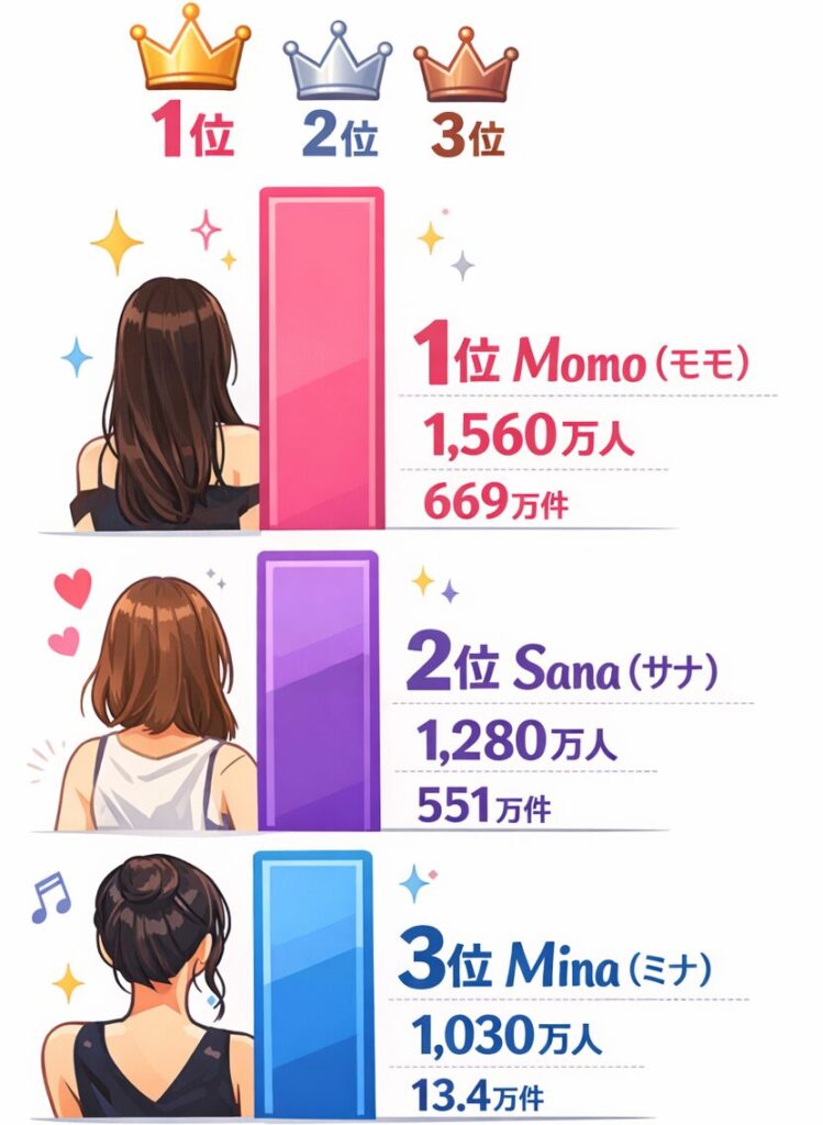 やっぱり数字で見るとモモちゃんの強さが際立ちますね…!でもサナちゃんの国民的な愛され力や、ミナちゃんの熱狂的なファン層の厚さも負けていませんよ