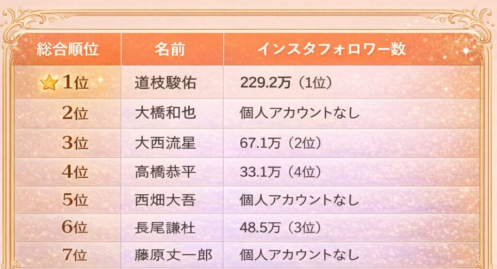 ・総合人気1位は、知名度とSNS影響力の強さが際立つ道枝駿佑