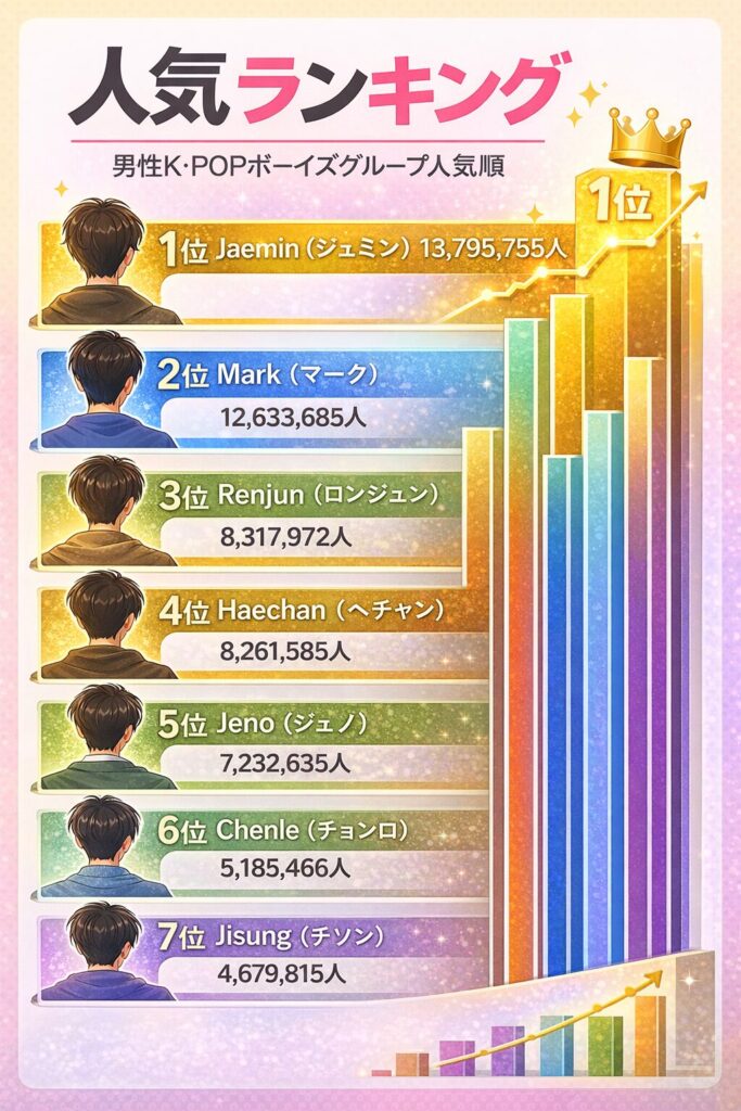 | 1位 | Jaemin(ジェミン) | 13,795,755人 | 圧倒的ビジュアルと愛嬌 |