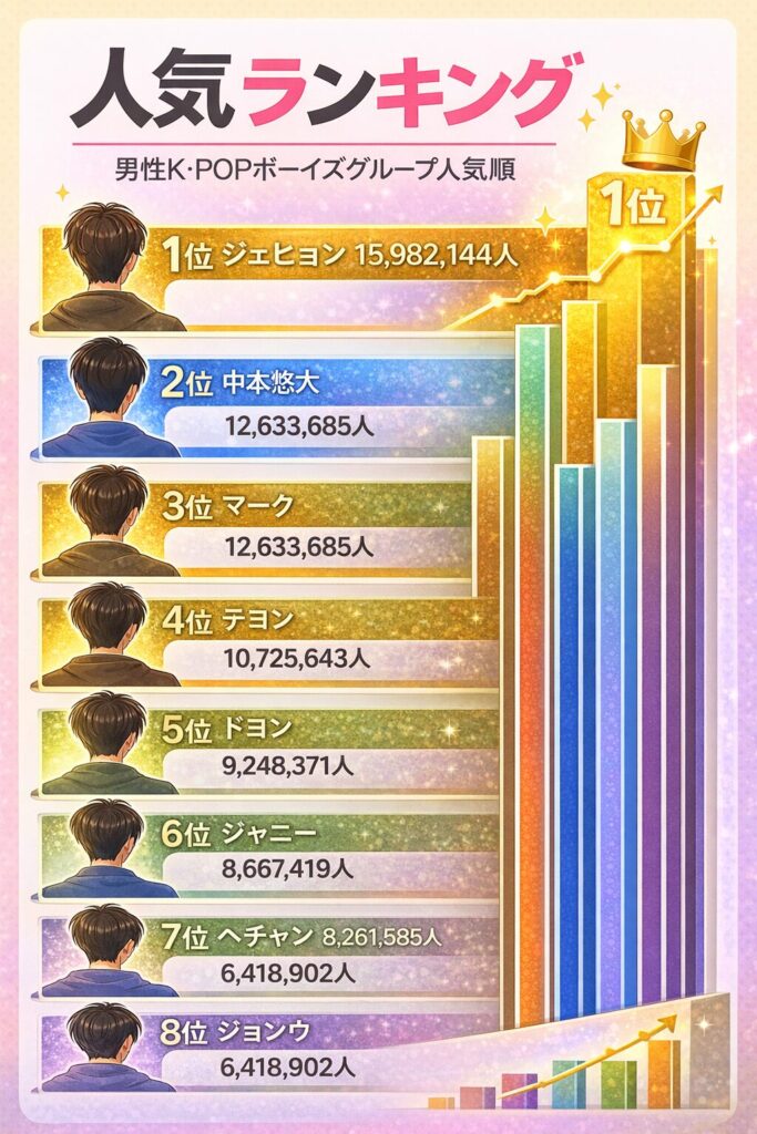 アメリカでは、ジェヒョンさんが1位というデータ(Google Trends、Ranker投票など)が多く見られます。彼の男らしいビジュアルと落ち着いた雰囲気は、欧米のファン層に強く刺さっているようです。