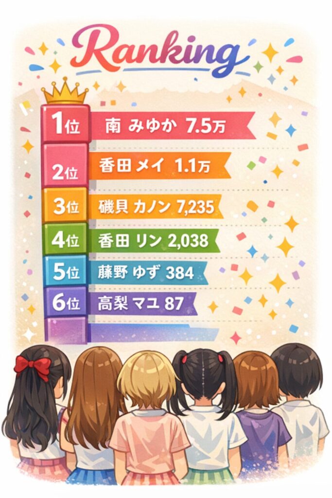 現時点ではSNSの数字が人気の指標になっていますが、ライブ活動が本格化すれば、パフォーマンス力のあるメンバー(香田リンさんや磯貝花音さん)や、愛されキャラの高梨まゆさんなどが一気に順位を上げる可能性も十分にあります。
