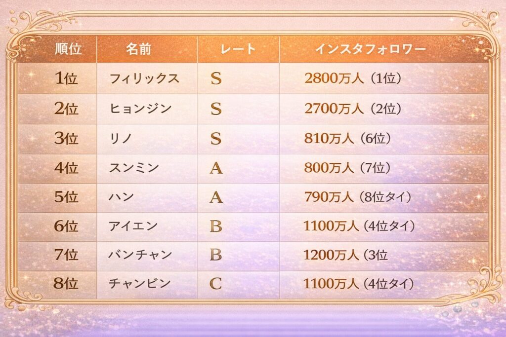 | 1位 | フィリックス | S | 2800万人(1位) | 世界的人気と現場人気の両方が最上位 |