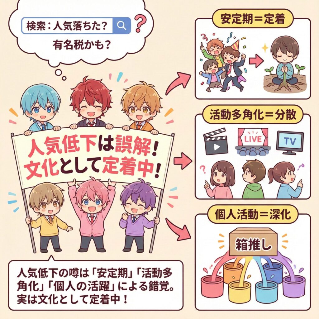 メンバー間の人気格差や“人気が落ちてる”という噂も飛び交い、ファンの間でも議論が加速しています。