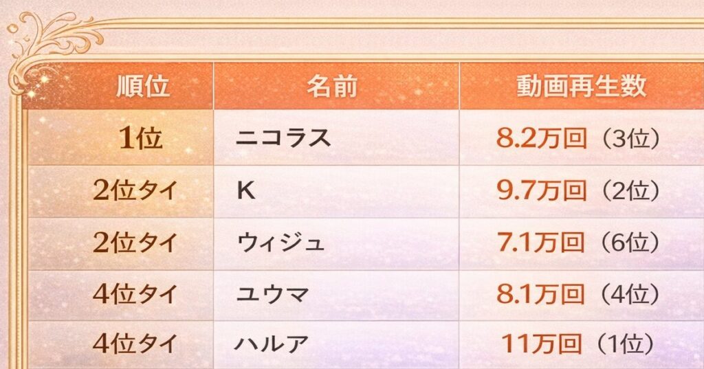 | 1位 | ニコラス | 8.2万回(3位) | 3位 | 1位 | 7点 |