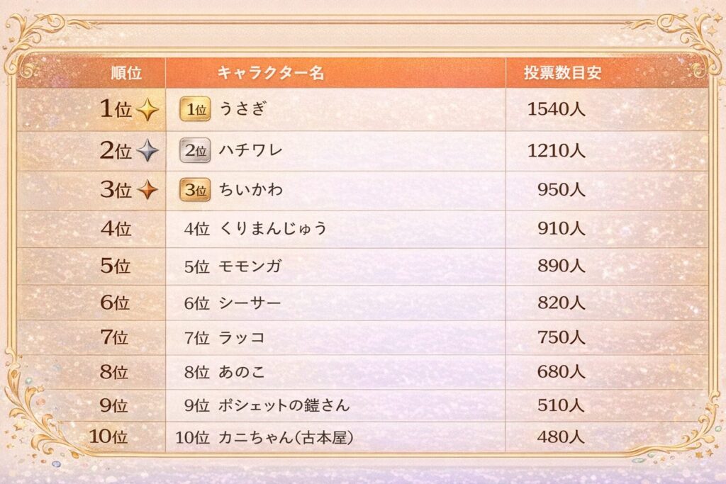 この3点を中心に、投票数の傾向をもとに、ちいかわの人気キャラを徹底整理していきます。
