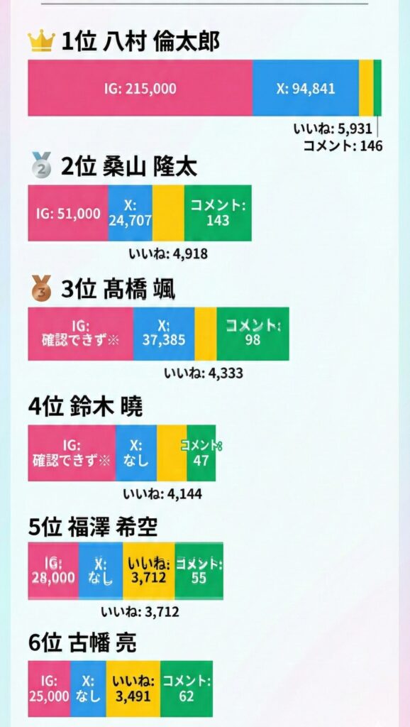 | 順位 | 名前 | インスタ | X | いいね数 | コメント数 |