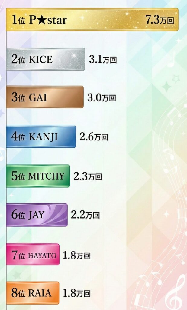 | 7位 | HAYATO | 1.8万回 | 970件 | 12件 | RAIAと同再生だがいいね数で上位 |